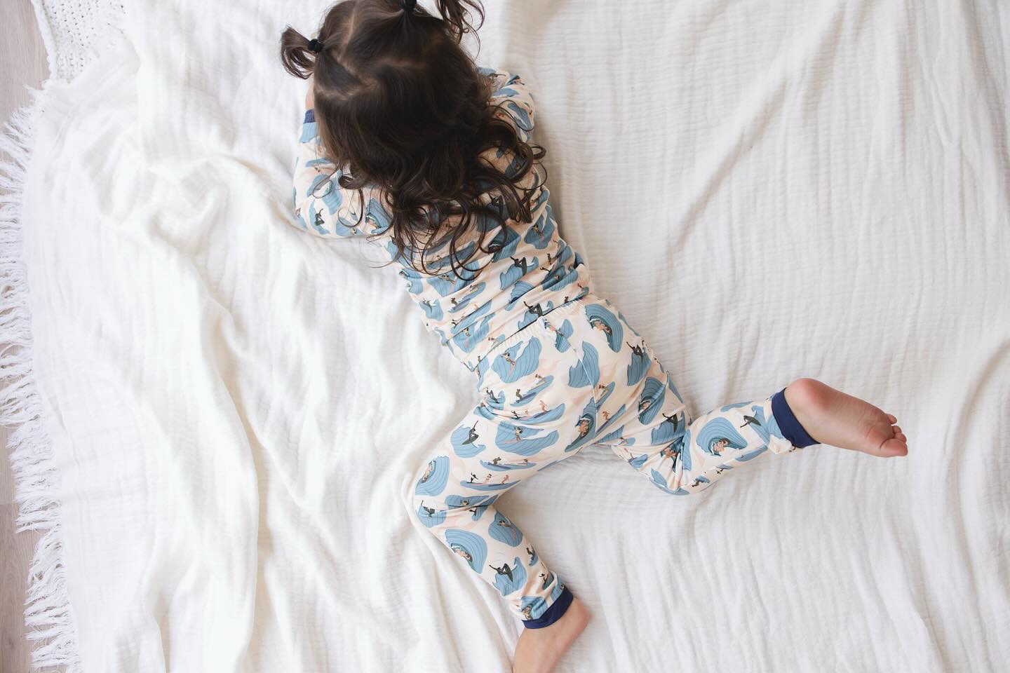 Our short sleeved toddler pajamas feature our signature organic bamboo rayon fabric. This print is very special to us because each surfer on the pattern represents one of our friends. We hope you fall in love with the playfulness of the print and comfort of the fabric. We promise this will be your toddlers go-to outfit to ensure a restful nights sleep.