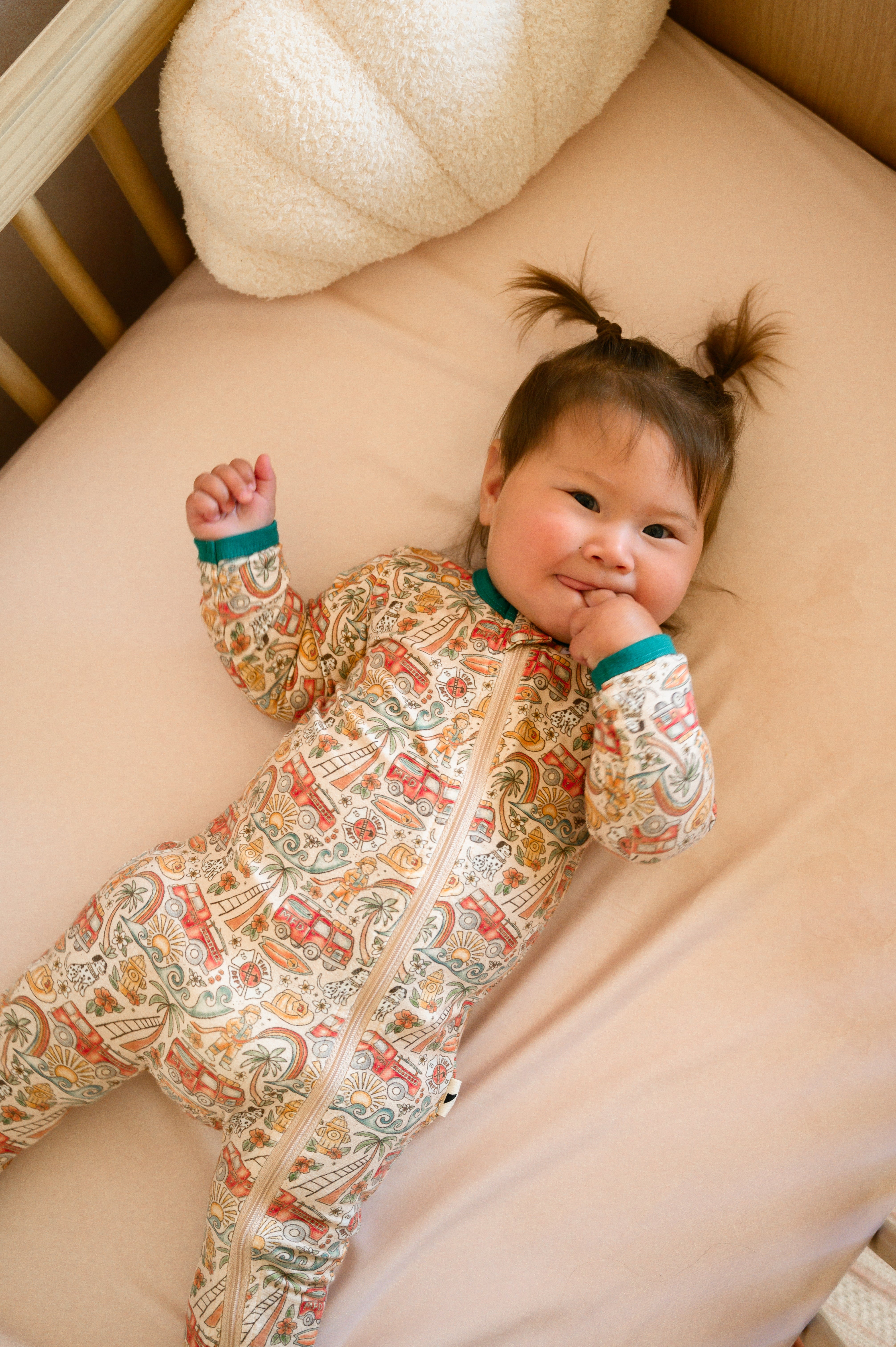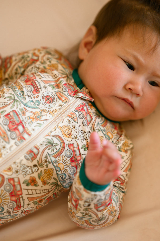 Our new Firehouse Friends Romper brings adventure and comfort together. Designed right here in Hawai‘i, the playful fire truck print sparks imagination while ultra-soft, breathable bamboo rayon keeps your little keiki cool, cozy, and moving freely. Perfect for racing to imaginary rescues, exploring the world, and drifting into dreamy nights, these pajamas are gentle on skin, kind to the planet, and made for little heroes with big imaginations.