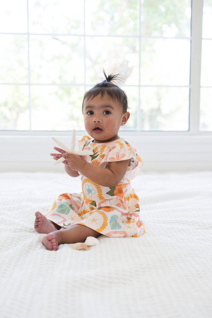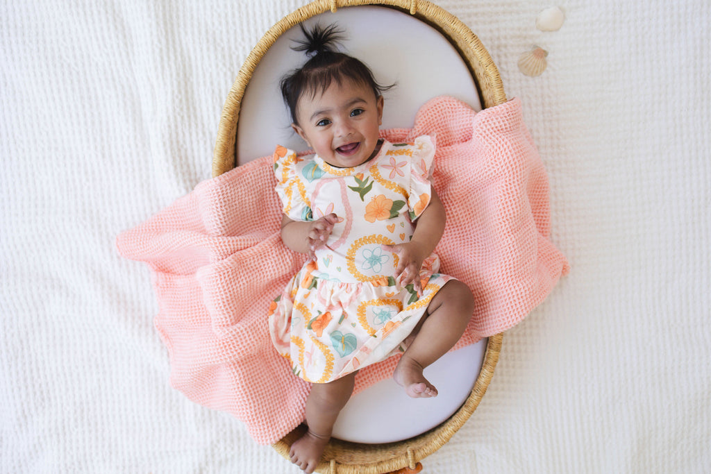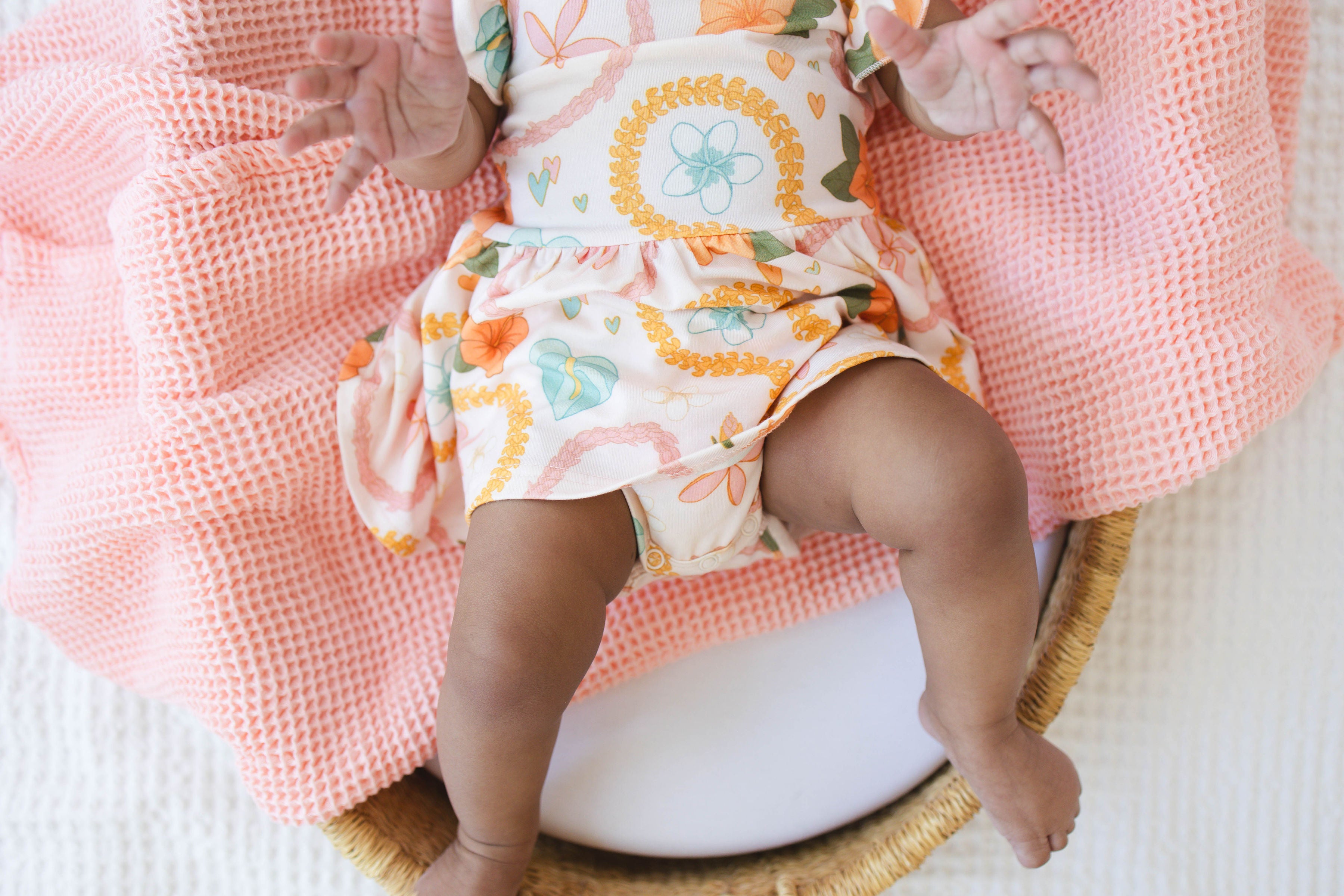 Our new Pua Party onesie is made for your little flower child. Featuring a sweet mix of tropical blooms and leis (designed right here in Hawaiʻi), this piece is as versatile as it is adorable. With ruffled sleeves, an open leg design, and buttery-soft comfort, it’s perfect for sunny days, cozy nights, and every season in between. Layer it up with a jacket or pants for extra style and warmth.